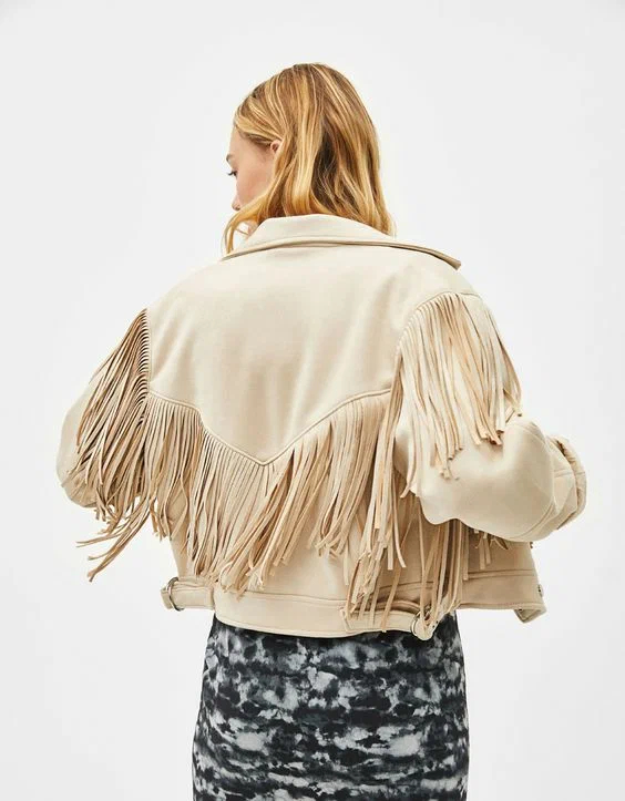 Наш список осінніх трендів відкриває довга бахрома, яка прикрашатиме собою багато вбрання і не тільки вже наступного місяця. Етнічні нотки присутні в актуальному стилі, саме це робить речі з бахромою по-своєму особливими. Тільки подивіться, як ефектно осінні куртки виглядають з довгою бахромою на спині і рукавах. Також при складанні осінніх луків можна використовувати сумки різних розмірів, прикрашені бахромою.