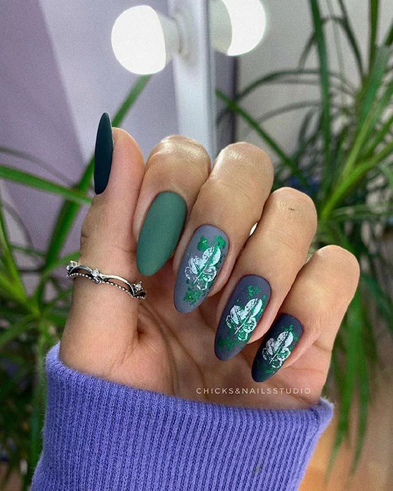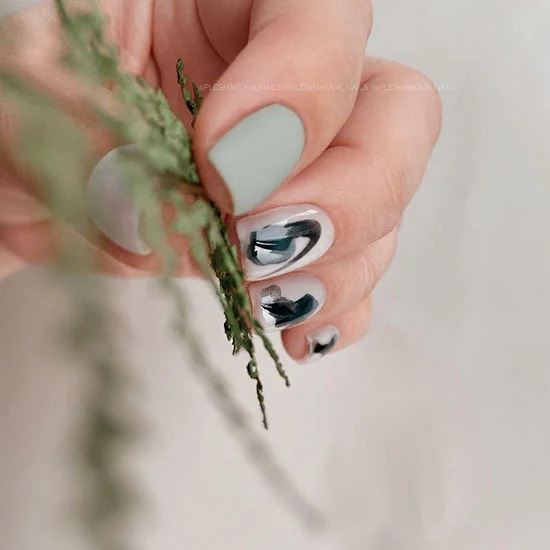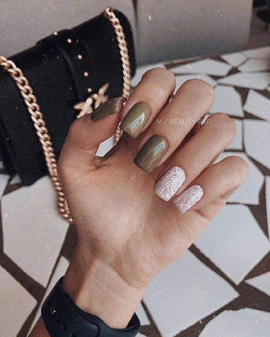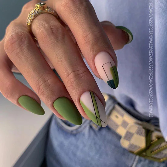 Болотний зелений колір може піднести сюрпризи – він по-своєму красивий і навіть в чомусь благородний. Поруч з таким кольором інші, більш яскраві кольори оживають і стають головним акцентом в нейл-арті.