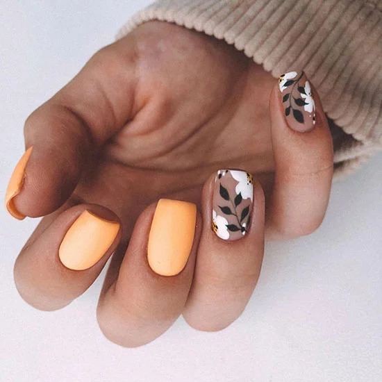 Одним з найпопулярніших дизайнів є флористичні мотиви, які майстрині відтворюють на ваших нігтях за допомогою найрізноманітніших технік. Найпростіше – наклейка або стікер, складний дизайн – ліпнина і малюнок кистями. Осінній манікюр з флорою може виглядати і так, як показано на фото вище.