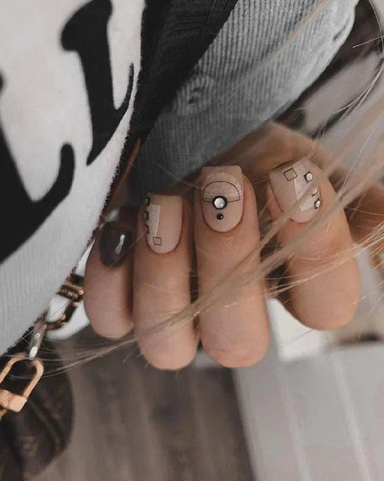 Мабуть, найспокійнішим і гармонійним варіантом буде манікюр в мінімалістичному дизайні з геометричними фігурами. Бежевий, білий і чорний колір створюють атмосферу гармонії і балансу. Креатив – стрази або блиск.