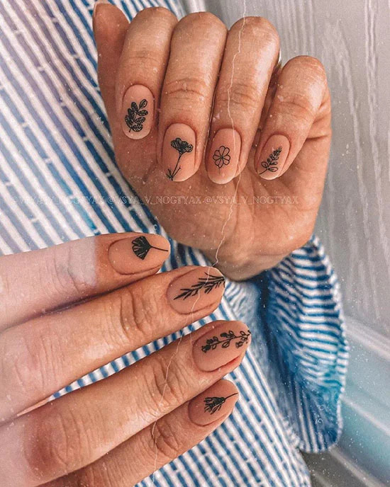 Бежевий колір в тон шкіри ваших пальців і флористичні малюнки в мінімалістичному стилі – виглядає непомітно, проте, такий нейл-арт досить незвичайний.