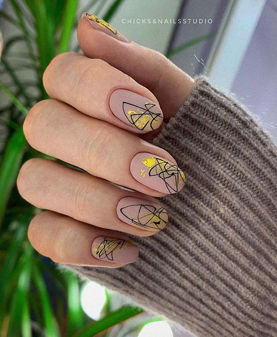 Іноді, щоб оживити манікюр в відтінках бежевого, варто додати абстрактні лінії і трохи блиску – так манікюр буде виглядати незвично, креативно і надовго запам’ятається.