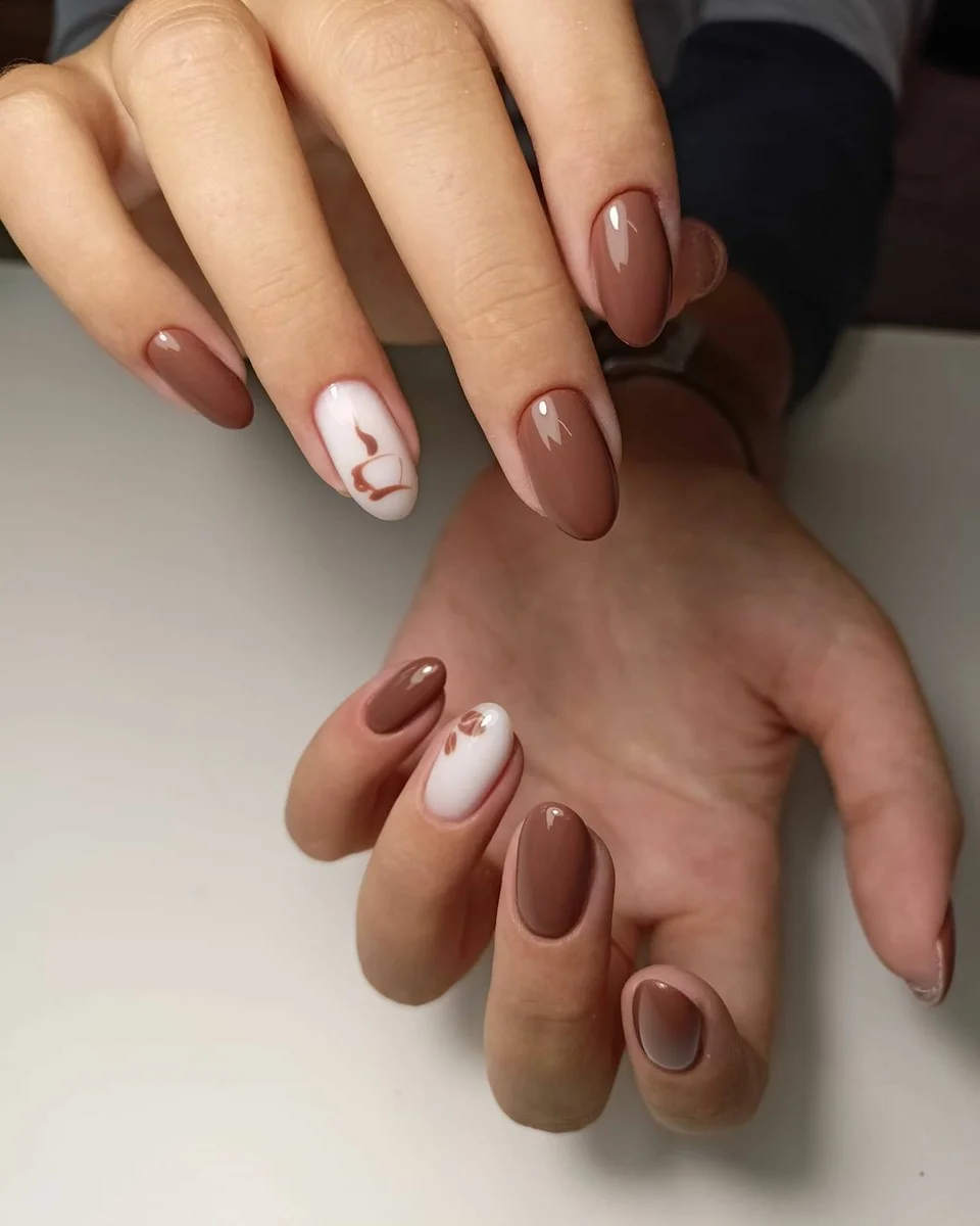 Трендом осіннього сезону 2021 вважається однотонне покриття в коричневій гамі, яке є універсальним і підходить жінкам будь-якого віку. Ефектно виглядає на нігтях будь-якої форми і довжини.