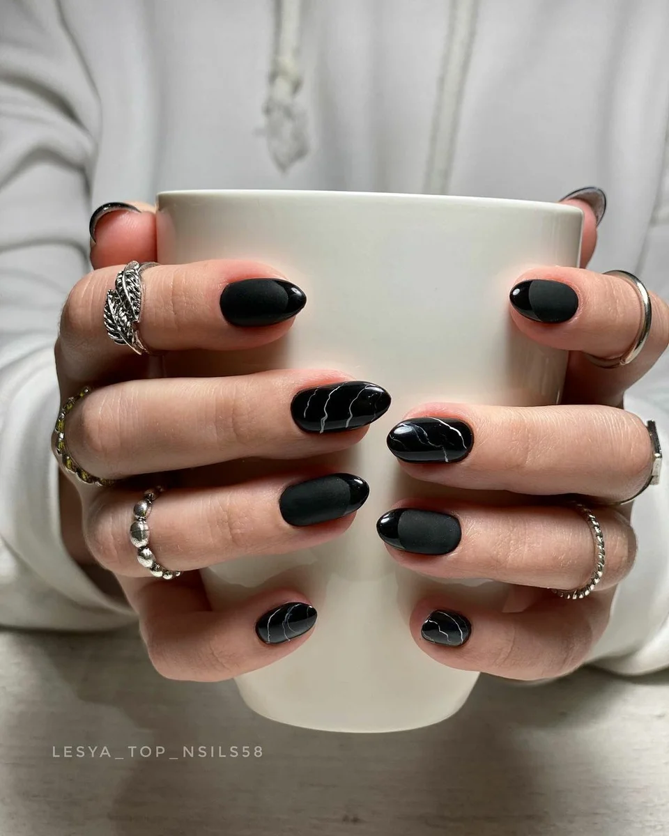 З настанням холодного сезону яскраві відтінки змінюються на більш приглушені і в той же час насичені але маст-хевом осінньо-зимового сезону є стильний манікюр в чорному кольорі. В даному випадку можна грати на видах покриття та додавати мінімалістичні малюнки або візерунки.