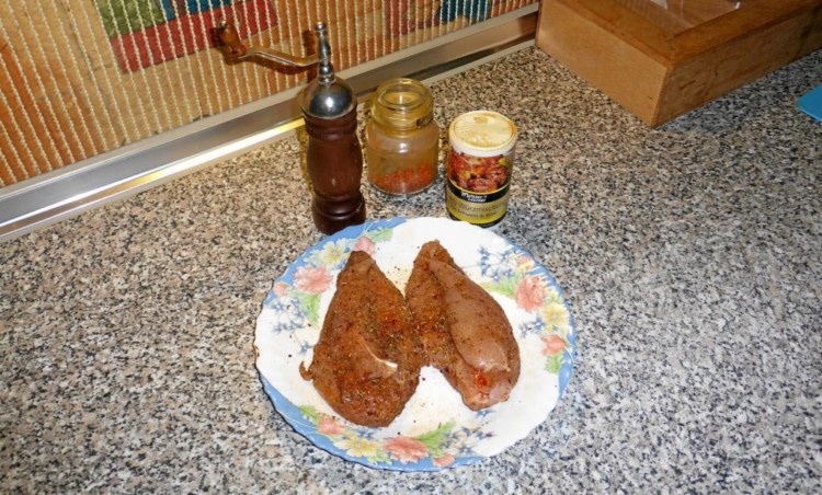 Страву готують наступним чином. Грудки треба посипати перцем і сіллю. Натерти сумішшю прянощів. Залишити курячі грудки на двадцять-тридцять хвилин. М’якоть повинна добре просочитися спеціями.