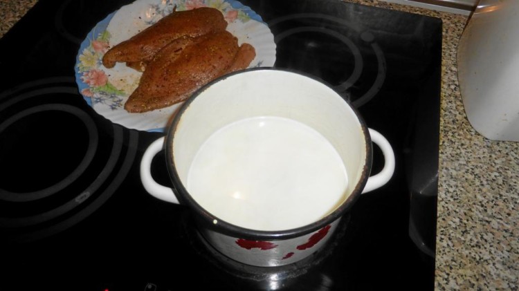 Молоко наливають в каструлю. Ставлять на вогонь і доводять до кипіння. Потім відразу занурюють в посудину курячі грудки, щоб молоко повністю закривало м’ясо.