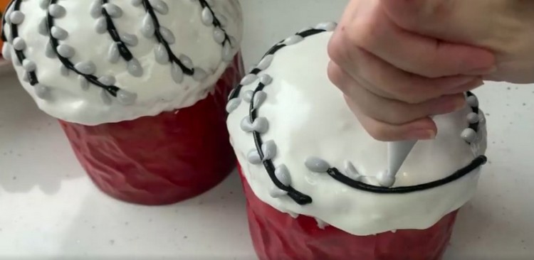 Частину глазурі, що залишилася, розділіть на 2 частини. В одну додайте трохи чорного харчового барвника, щоб отримати сірий колір. Розмішайте і перекладіть в кондитерський мішок без насадки.