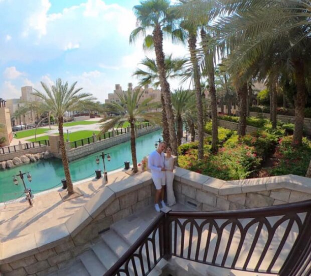 Наречені позують на тлі однієї з визначних пам’яток в Дубаї – готель-вітрило. Ганна у білосніжній сукні по фігурі з тонкого мережива. Свій весільний образ дівчина доповнила трендовою зачіскою – гладкий кінський хвіст з білосніжними стрічками.