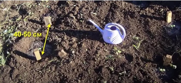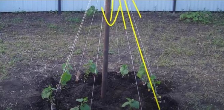Через три тижні після того, як наша розсада починає сходити, доведеться подумати про те, куда її прив’язати. У центр грядки закопуємо товсту стійку палицю, можна металеву. Висота її – 3 метри, один з яких необхідно закопати, а 2, що залишилися, залишити на поверхні.