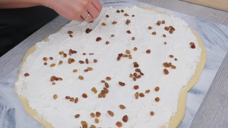 Далі наносимо по всій площі сирну начинку, ще можна посипати родзинками, але це за бажанням. Ізюм не забуваємо добре промивати і при необхідності замочити.