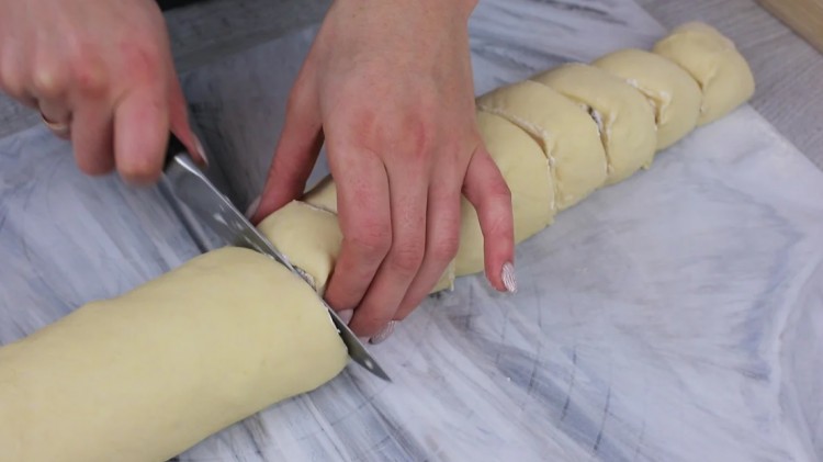 Коли минув необхідний час і тісто добре піднялося, розгортаємо його. Розкачуємо не сильно тонко, так булочки будуть більш пухкими.