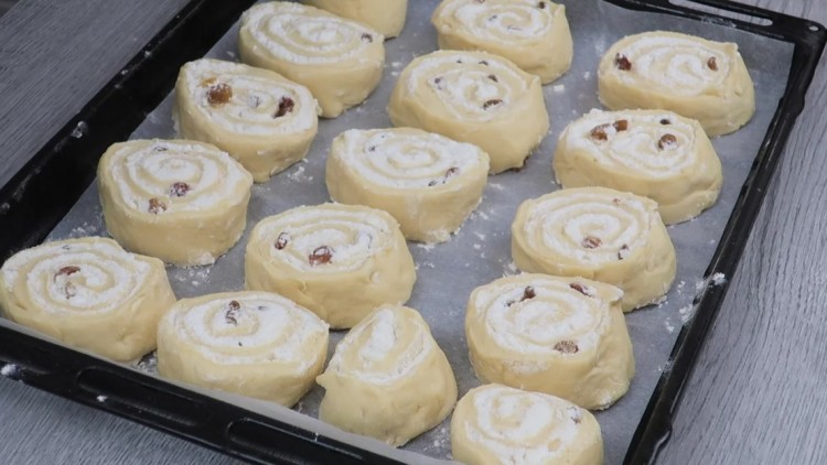 Одну сторону булочки обвалюємо в борошні і викладаємо на деко. Накриваємо рушником і залишаємо на 25 хвилин для вистоювання.