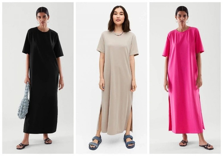 Один з універсальних варіантів, який прекрасно підходить для спекотної погоди: довга сукня-футболка вільного крою. Для зручності з боків можна передбачити розрізи.