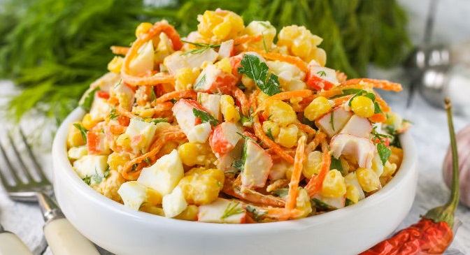 Ці інгредієнти теж відправляємо в миску. Потім додаємо консервовану кукурудзу й акуратно перемішуємо. Солимо та перчимо за смаком. Часник пропускаємо через прес та змішуємо з майонезом. Соусом заправляємо салат. Потім відразу подаємо його до столу. Смачного!