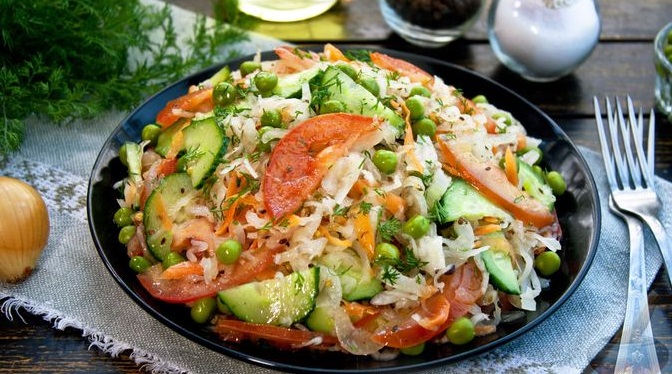 Салат з квашеною капустою, зеленим горошком, огірками та помідорами