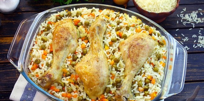 Гомілки теж посипаємо сіллю та спеціями. Викладаємо на рис та вливаємо 500 мл. води. Відразу відправляємо в духовку. Рис з куркою готуємо 50 хвилин при температурі 190 градусів. До столу страву подаємо гарячою. Смачного!
