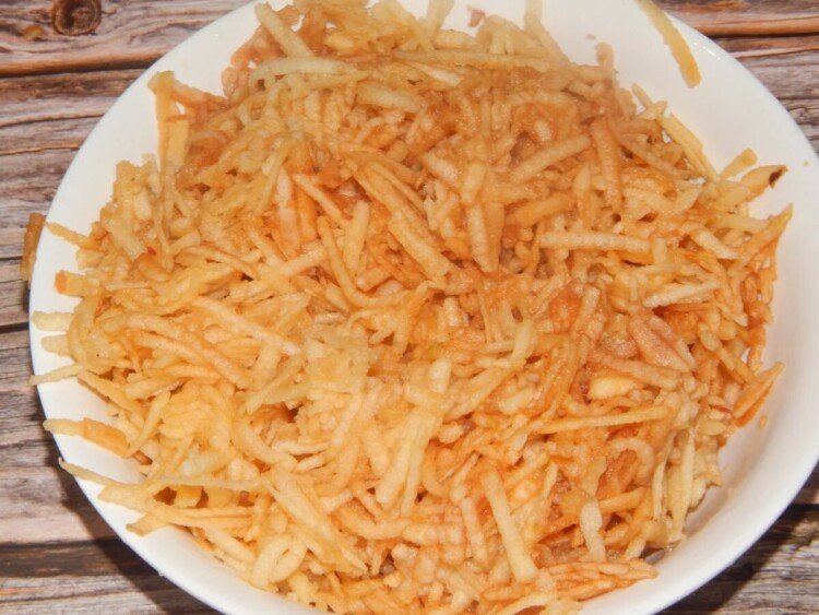Начинку з яблук перемішуємо, також ділимо на 3 рівні частини. Яблука потемніють, але так і повинно бути.