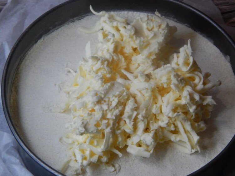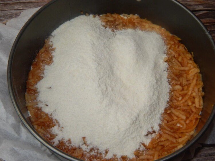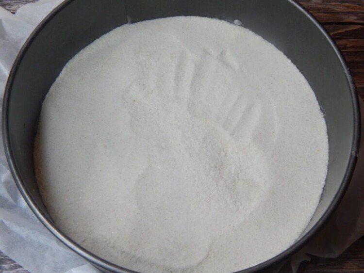 Дно форми (у нас 18 см) застилаємо пергаментним папером і висипаємо першу частину сухої суміші.
