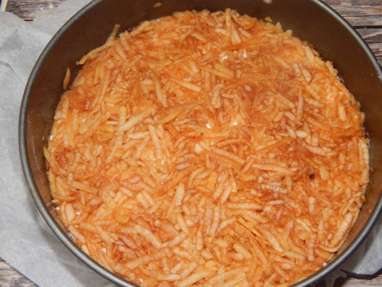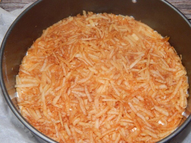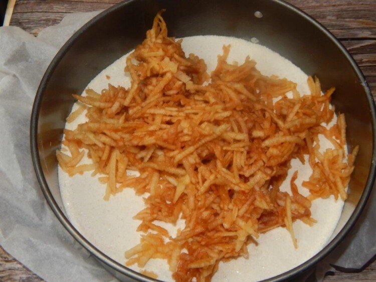 Має вийти 4 шари сухої суміші і три шари яблук.