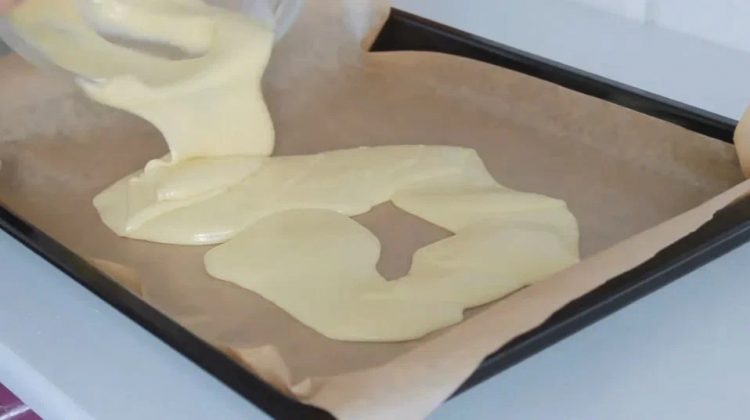 Деко застилаємо пергаментним папером, присипати нічим не потрібно (ми користуємося папером з силіконом, до нього нічого не пристає). Виливаємо тісто, розподіляємо його рівномірним шаром. Потім ставимо у розігріту духовку буквально на 5 хвилин. Корж випікається дуже швидко – достатньо, щоб він підрум’янився і піднявся.