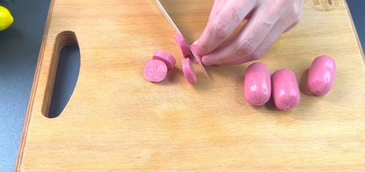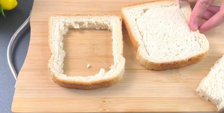 Нарізаємо хліб на скибочки. Ми використовували тостовий хліб у вигляді цегли, який вже був нарізаний на порції. Взяли кілька скибочок і вирізали з них м’яку серединку.