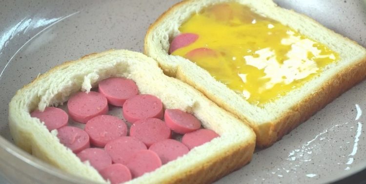 Викладаємо скоринку хліба та ставимо по центру ковбасу, потім вливаємо у кожну порцію по яйцю.