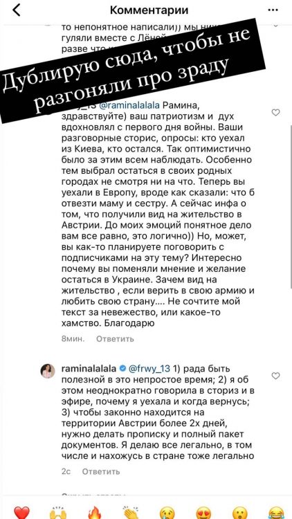 Ведуча і блогерка Раміна Есхакзай, яка кількома тижнями раніше виїхала за кордон, щоб евакуювати з Києва свою матір, отримала дозвіл на проживання в Австрії. Після того, як вона про це повідомляла, передплатники виявили активний інтерес до цієї теми. Багато хто почав дорікати зірці у зраді Батьківщині. Блогерша відповіла на ці закиди у себе в інстаграм-історіях.