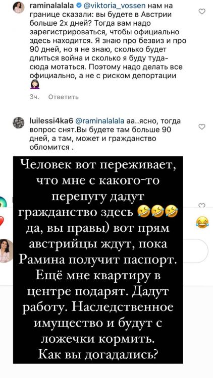 “От прямо австрійці чекають, поки Раміна отримає паспорт. Ще мені квартиру в центрі подарують. Дадуть роботу. Спадкове майно. І будуть з ложечки годувати”.