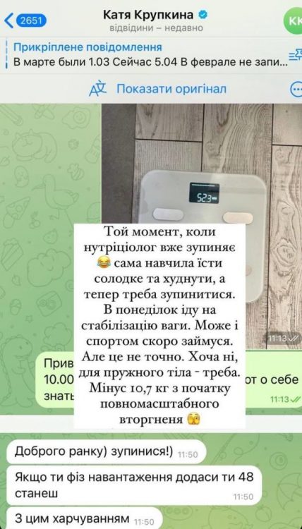 Не так давно Раміна Есхакзай розсекретила свою вагу. А ще журналістка зізналась, на скільки кілограмів схудла під час війни. Подробицями вона поділилась в Instagram-stories. Раміна Есхакзай показала кадри переписки зі своїм нутріціологом. Як виявилось, наразі жінка важить 52 кілограми. Блогерка зізналась, що хоче стабілізувати свою вагу.