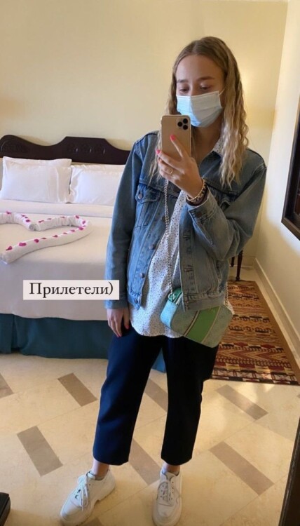 Дружина Віктора Павліка вже встигла провести рум-тур своєї кімнати та похизуватись стильним образом. У своїй Instagram-story майбутня мама запостила світлину, на якій позує біля величезного ліжка. Катерина Реп’яхова постала перед камерою в темно-синіх штанах, білій блузці та джинсовій куртці. Свій образ жінка доповнила стильною сумочкою та кросівками.