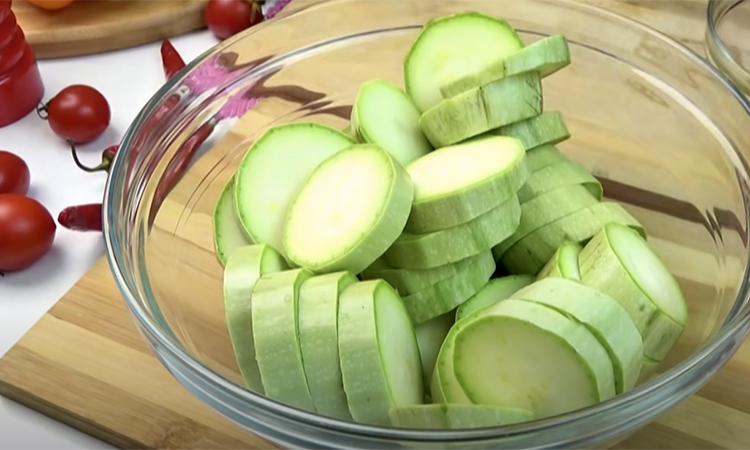 Спочатку потрібно нарізати кабачки кільцями та перекласти у велику тарілку. В окремій посудині з’єднати оливкову олію з сіллю, перцем чилі та часником. Все добре перемішати.