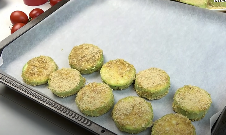 Потім всю суміш необхідно вилити на кільця кабачків. Кожний шматочок обвалюємо у панірувальних сухарях та викладаємо на форму, застелену пергаментним папером. Кабачки повинні запікатись 15-20 хвилин.