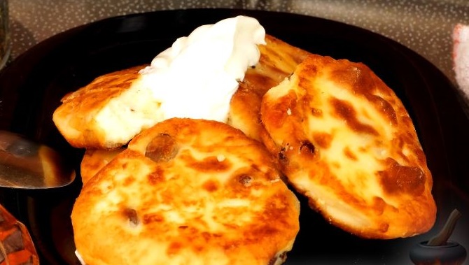 З отриманої суміші формуємо сирники круглої форми. Сковорідку змащуємо олією або вершковим маслом. Викладаємо туди сирники й смажимо з двох боків до рум’яної скоринки. Поливаємо їх сметаною та відразу подаємо до столу. Смачного!