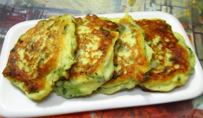 Картоплю відварюємо у мундирах. Охолоджуємо, знімаємо шкірку та натираємо на тертці. В мисці змішуємо борошно, сіль та розпушувач. Додаємо молоко та перемішуємо. Потім подрібнюємо зелень. Додаємо до тіста й перемішуємо.