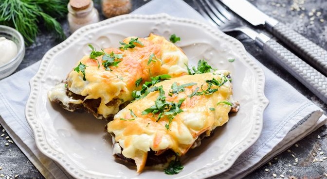 Відбивні з яловичої печінки, запечені під “шубкою” з цибулі, яблук та сиру