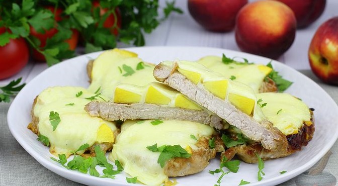 Тим часом персики очищуємо й нарізаємо на шматочки. Моцарелу натираємо. На кожну відбивну кладемо по 2-3 шматочки персика. Посипаємо сиром та запікаємо в духовці 10 хвилин при температурі 180 градусів. Смачного!