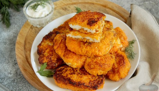 Потім всипаємо борошно. Знову перемішуємо. Відбивні обвалюємо в борошні, а потім морквяній суміші. Викладаємо їх на розігріту сковорідку та смажимо до золотистого кольору. Смачного!