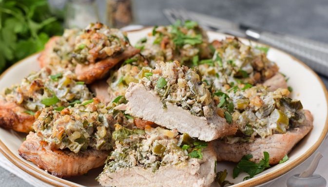 Відбивні зі свинини, запечені з маринованими огірками та волоськими горіхами