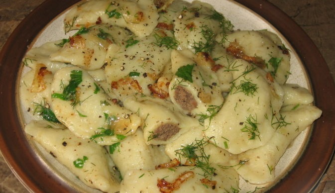 З готового тіста формуємо кружечки та викладаємо начинку. Вареники варимо у киплячій воді до готовності. Тим часом ріпчасту цибулю обсмажуємо на вершковому маслі. Заправляємо нею вареники та посипаємо зеленню. Смачного!