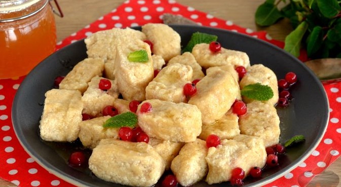 Потім вареники викладаємо в миску. Поливаємо їх медом й розтопленим вершковим маслом. Перемішуємо та відразу подаємо до столу. Смачного!