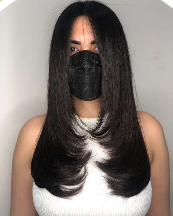 До рівних стрижок на довге волосся можна віднести стильну драбинку. У ній лише передні пасма виконуються по різній довжині, а задня частина волосся залишається з прямим зрізом. Такий вид стрижки якраз чудово підходить тонким кучерям, яким не вистачає об’єму. За рахунок локонів, що обрамляють обличчя, жінка в будь-якому віці виглядає надзвичайно, а завдяки прямому зрізу і довгому волоссю можна експериментувати з зачісками. Драбинку варто урізноманітнити рівним чубком або зробити її в техніці, що дозволяє чубку плавно переходити в довжину передніх пасм.