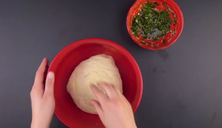 Почніть зі змішування борошна, солі і масла в мисці. Змішайте дріжджі, цукор і молоко окремо перед тим, як вилити їх в миску. Замісіть руками і скачайте кульку, залиште при кімнатній температурі на годину.