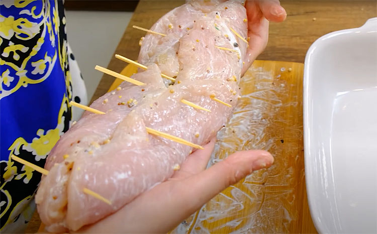 4. Відбите та замариноване філе викладаємо з невеликим нахлестом одного шматка на інший. По центру м’яса викладаємо начинку, навколо якої підгинаємо краї та фіксуємо їх за допомогою зубочисток. Акуратно перекладаємо рулет у форму для запікання вниз швом.