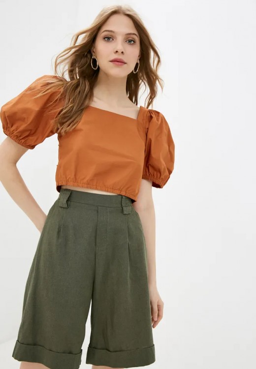 Створити динамічний і фактурний образ допоможе топ із структурованої тканини з великими об’ємними рукавами. Він органічно виглядає зі спідницями по фігурі, розкльошеними брюками і джинсами, а також з широкими шортами.