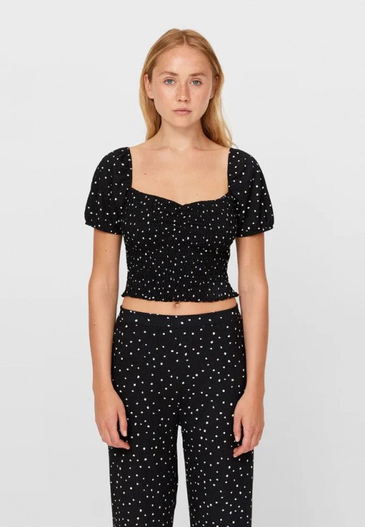 Універсальний варіант на кожен день – лаконічний топ в горошок з квадратним вирізом. Можна носити його і з лляними шортами, і з літніми спідницями міді, і з елегантними штанами палаццо.