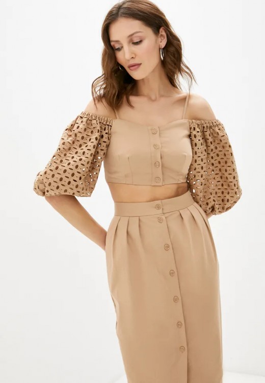 Топ в корсетному стилі з перфорацією органічно впишеться в вечірній наряд. Доповніть його спідницею з високою посадкою, декорованим обідком і витонченими босоніжками.