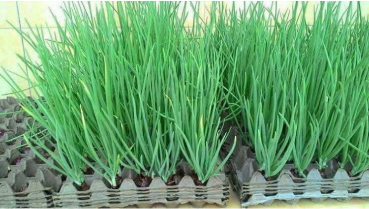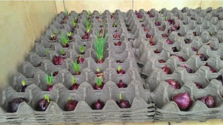 Нам потрібні лотки з-під яєць. Беремо 3 лотка для яєць і складаємо їх в одну стопку. У кожну з лунок наливаємо воду і кладемо в неї цибулину. Як тільки вода буде висихати, додавайте її знову.