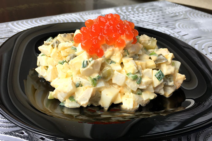 Під час подачі можна прикрасити його червоною ікрою. Дуже смачно виходить. Мариновані огірочки надають яскравого, пікантного смаку.