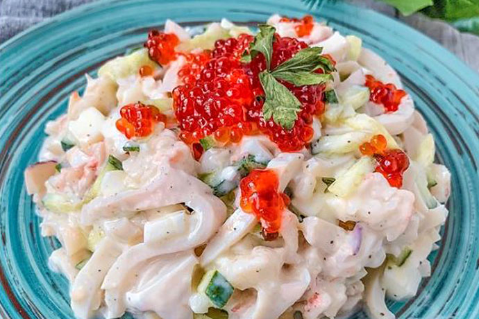 Салат готовий. Прикрашаємо ікрою та зеленню. Подаємо на стіл. Смачного!