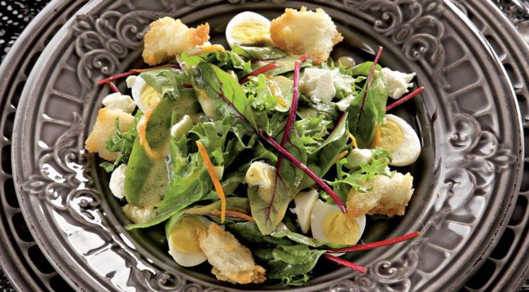 В миску викладаємо мікс з салатного листя. Додаємо яйця, бринзу та підсмажений багет. Апельсиновий сік змішуємо з гірчицею, олією та спеціями. Перемішуємо й заправляємо салат. Смачного!